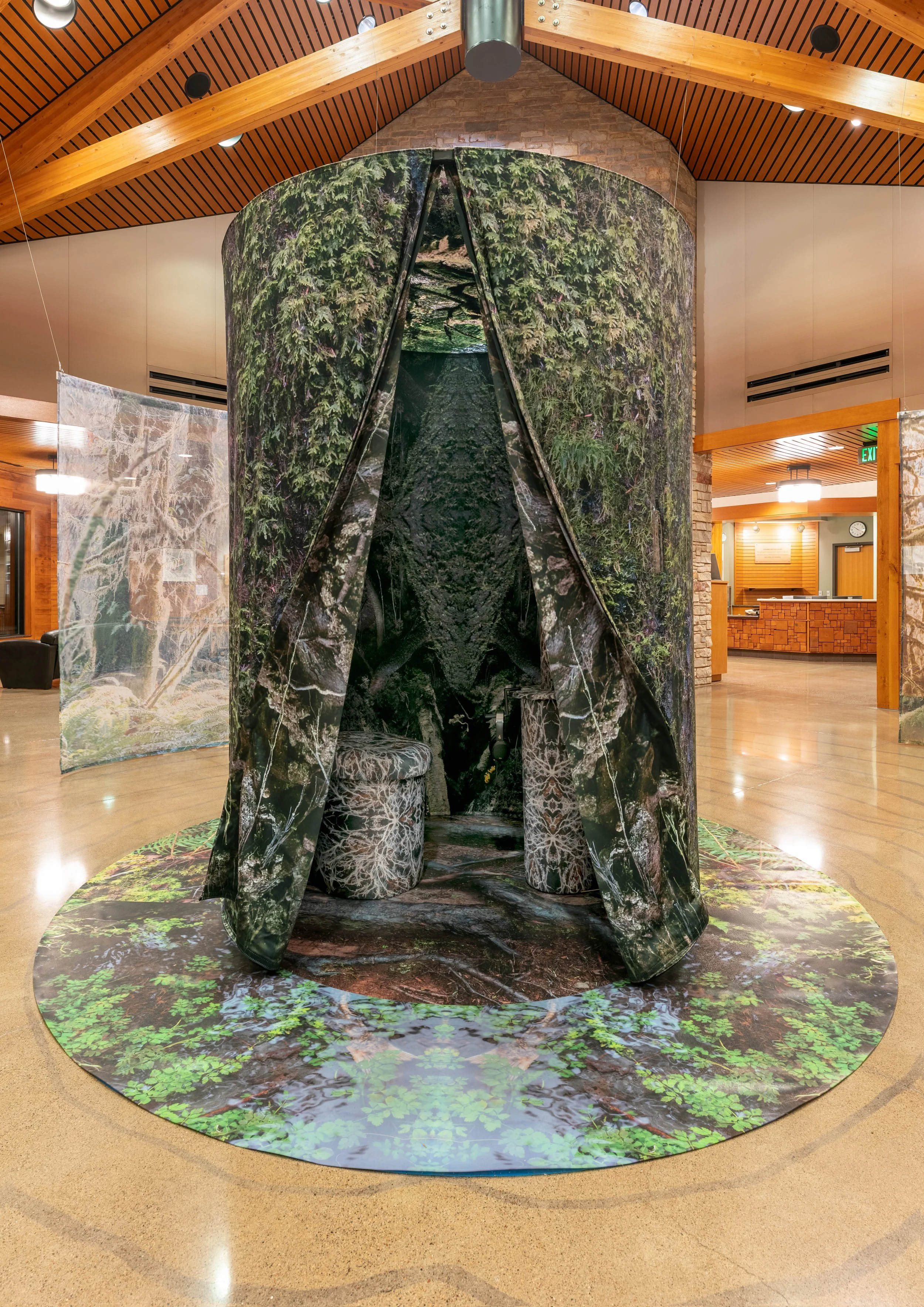 Sylvan Essence is a multi-sensory, interactive installation exploring the visual, auditory, and aromatic language of the Hoh Rainforest, a temperate rainforest situated on the ancestral lands of the Hoh and Quileute Tribes. Using image, sound, and scent from the Hoh, Sylvan Essence employs photography, sculpture, sound, and olfactory elements, allowing the viewer to see, hear, and smell the entangled web of relationships and complex conversations that make up the arboreal universe. Drawing from scientific research on plant communication, plant sensing, and tree bioacoustics, this piece coaxes the imagination to think and breathe in attunement with the trees. In this space, the viewer sees images of the forest, smells the fragrance of the moss and the trees, and they hear sounds of the Hoh. They can walk around and move inside a tree-like photo-sculpture, a moss-covered tree trunk on the outside, root structures and the smell of earth on the inside. Situated within the “tree,” they can look up at the tree canopy and find a place to rest on a mycelial stool. The mycelia are the “internet” of the forest, a complex fungal network beneath the ground enabling both communication and resource-sharing between living organisms in the forest. Here the viewer can “connect with the connectors.” They can also listen to the resonant, deep, rumble of the tree roots, a unique underground language recorded from a giant mother tree. As a human being ensconced in this reconstructed forest cosmos, viewers have an opportunity to imagine “becoming-with” a multi-species ecosystem that is based on resource-sharing, synergism, and regeneration. As such, Sylvan Essence embodies the systems logic of the forest, without boundaries and hierarchies, where human beings, like trees, live interconnected in body, mind, and spirit. As a maker, I use this as an opportunity to reimagine more synergistic systems, proposing a world where multi-species intersectionality is possible.